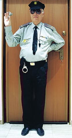«Δεν είναι τυχαίο ότι φοράω τη στολή του σερίφη, την οποία έφτιαξα μόνος μου αγοράζοντας όλα τα απαραίτητα από το Μοναστηράκι, καθώς η εφεύρεση έχει το όνομα sheriff κι αυτό γιατί για εμένα λειτουργεί σαν αστυνομικός της πόρτας» λέει χαρακτηριστικά και καταλήγει: «Βρέθηκα και στη ΔΕΘ, προκειμένου να παρουσιάσω την εφεύρεση που ενθουσίασε το κοινό, αφού όλοι πείστηκαν για τις δυνατότητές της. Τους απέδειξα πως όχι μόνο το κλειδί που παραμένει πάνω στην πόρτα δεν βγαίνει με τίποτα, αλλά και ότι δεν υπάρχει άλλος τρόπος για να ανοίξει».