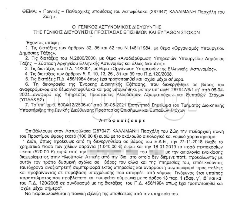 Πάντως, η υπόθεση διαβιβάστηκε και στη Διεύθυνση Αστυνομικού Προσωπικού της ΕΛ.ΑΣ. που διέταξε ΕΔΕ, αλλά ο Καλλιμάνης έπεσε «στα μαλακά» με ένα ευτελές πρόστιμο 100 ευρώ!