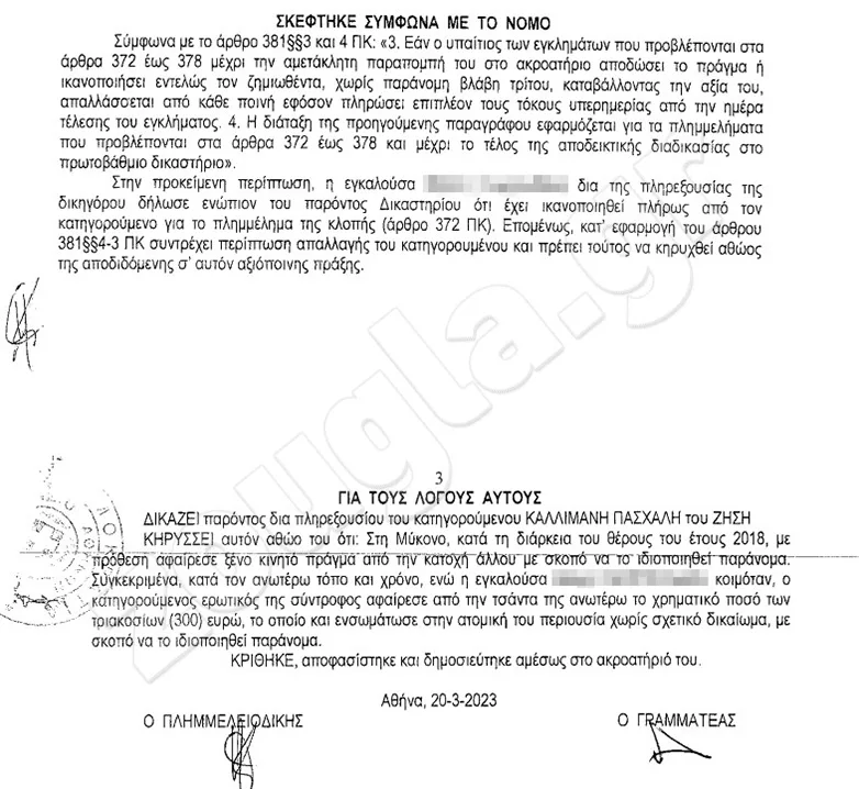 Οι αρμόδιοι της Αστυνομίας έκαναν τα στραβά μάτια και δεν ερεύνησαν περαιτέρω την υπόθεση, παρότι η κοπέλα κατήγγειλε τη δεύτερη δουλειά του αστυνομικού των Επισήμων ως… μετρ σε εστιατόριο της Μυκόνου. Η υπόθεση εκδικάστηκε και ο Πασχάλης Καλλιμάνης υποχρεώθηκε από το δικαστήριο να καταβάλει μέρος των χρημάτων που είχε αποσπάσει. Τελικά ο αστυνομικός απηλλάγη τον Μάρτιο του 2023 επειδή ήρθε σε εξωδικαστικό συμβιβασμό με τη δικηγόρο της καταγγέλλουσας.