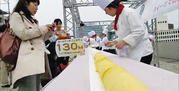 Οταν ολοκλήρωσαν το γλυκό τους, οι υπεύθυνοι του βιβλίου με τα παγκόσμια ρεκόρ έβγαλαν τη μεζούρα και μέτρησαν ακριβώς 130 μέτρα και 68 εκατοστά! Αμέσως απένειμαν τον τίτλο του μακρύτερου κέικ στον κόσμο στους ενενήντα επαγγελματίες σεφ και φοιτητές ζαχαροπλαστικής ενός κολεγίου κέτερινγκ στο Τόκιο. Για την ιστορία, για το τεράστιο κέικ χρησιμοποιήθηκαν 54 κιλά αλεύρι, 43 κιλά ζάχαρη και 2.682 αβγά! Οταν ολοκληρώθηκε, οι ζαχαροπλάστες του έβαλαν ως γαρνιτούρα 100 κιλά σαντιγί, 10 κιλά ζάχαρη άχνη, 45 κιλά χρυσόσκονη μαγειρικής και άλλα διακοσμητικά.
