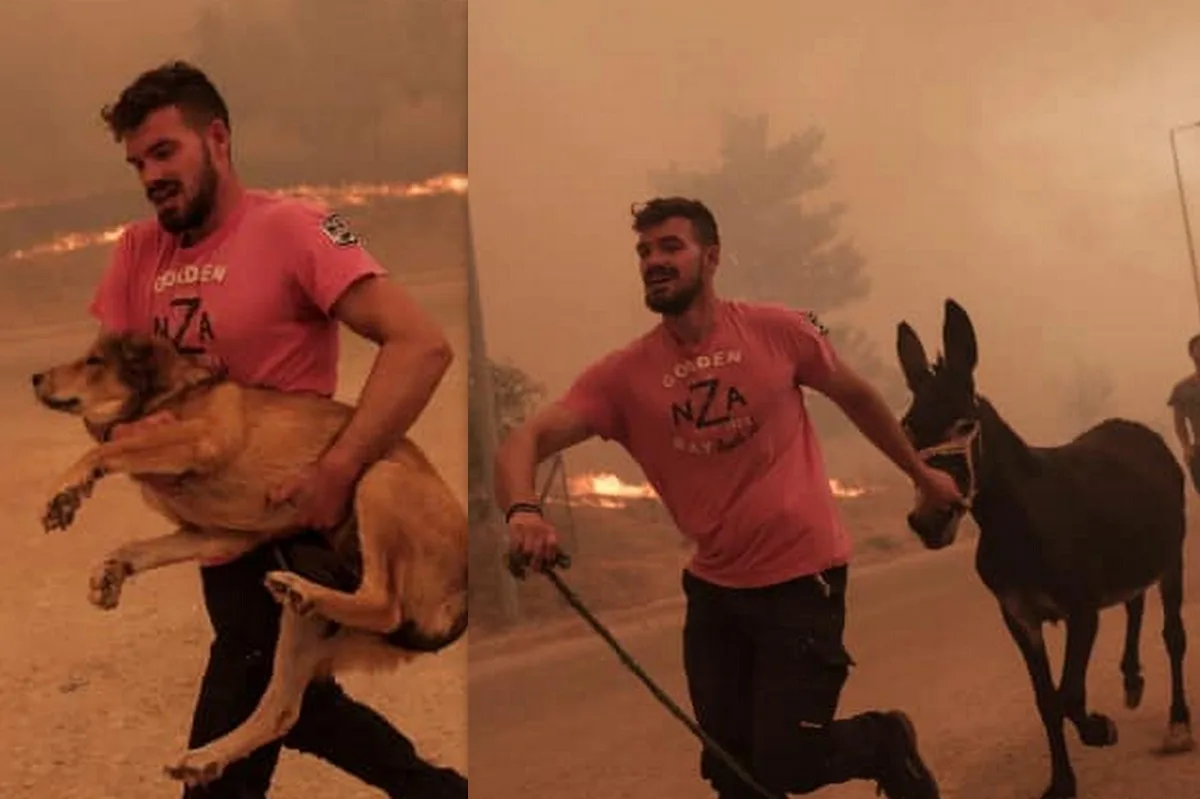 Μέσα στη βιβλική καταστροφή με τη φωτιά να καίει δάση και σπίτια είδαμε έναν νεαρό άντρα να τρέχει με ένα σκυλάκι αγκαλιά και αργότερα τραβούσε τα άλογα για να τα γλιτώσει από τις φλόγες.