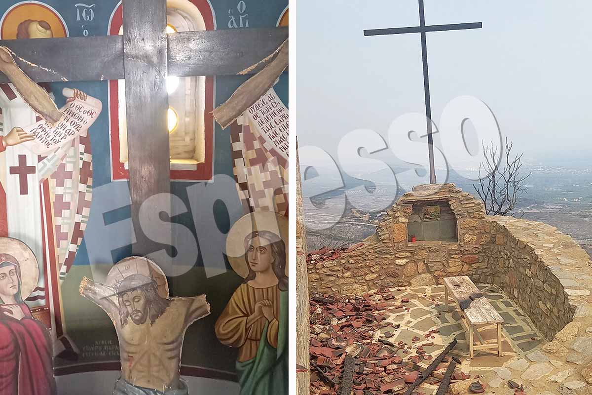 «Ανέβηκα στο βουνό αμέσως μετά τις πυρκαγιές και ήμουν ο πρώτος που αντίκρισε το θέαμα της βεβήλωσης του Εσταυρωμένου! Βρισκόταν με κομμένα τα χέρια και παρατημένο το σώμα του Χριστού στο πάτωμα, ριγμένο στο κάτω μέρος του Σταυρού, πίσω από την Αγία Τράπεζα. Δεν μπορούσα να πιστέψω αυτό που έβλεπα, δεν μπορούσε να βάλει το μυαλό μου ποιος θα μπορούσε να κάνει κάτι τέτοιο. Την τελευταία φορά που είδα τον Χριστό ανέγγιχτο στον Σταυρό ήταν μια ημέρα πριν ξεσπάσει η μεγάλη πυρκαγιά. Μετά την κατάσβεσή της επισκέφτηκα το παρεκκλήσι (χθες, Πέμπτη) για να δω το μέγεθος της ζημιάς. Μπαίνοντας στο εσωτερικό του ναού, παρότι ολόκληρη η εξωτερική του πλευρά και το κιόσκι με τα κεραμίδια είχαν γίνει ρημαδιό, διαπίστωσα ότι ήταν ανέπαφος. Το ίδιο και η Αγία Τράπεζα.