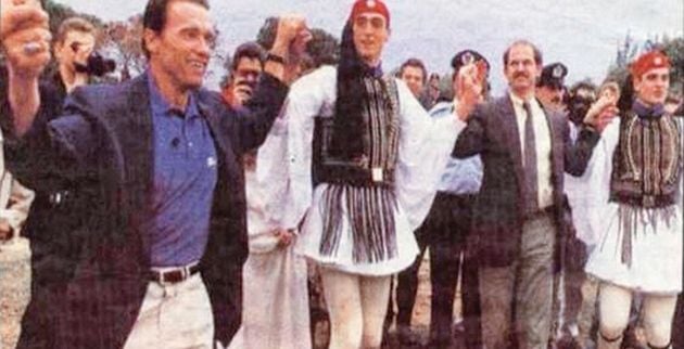 Μια φωτογραφία ρετρό κυκλοφορεί τις τελευταίες ώρες στο διαδίκτυο. Δείχνει τον Γιώργο Παπανδρέου να χορεύει τσάμικο μαζί με τον Αρνολντ Σβαρτσενέγκερ και Εύζωνες της Προεδρικής Φρουράς.