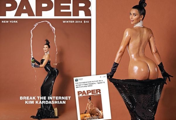 Στο χειμερινό τεύχος του «Paper Magazine» η reality σταρ ποζάρει φορώντας μονάχα ένα ζευγάρι μακριά μαύρα γάντια και ένα τσόκερ από πέρλες, έχοντας κατεβάσει τη μαύρη βραδινή τουαλέτα της ακριβώς κάτω από τους γλουτούς της, οι οποίοι έχουν αποκτήσει εκτυφλωτική λάμψη από το λάδι με το οποίο είναι αλειμμένοι.