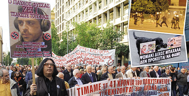 Ο Ανδρέας Ευαγγελόπουλος έκανε τις φωτογραφικές μηχανές και τις κάμερες των κινητών τηλεφώνων των διαδηλωτών να… αστράψουν όταν εμφανίστηκε στην οδό Σταδίου υψώνοντας ένα πλακάτ για τον δολοφονηθέντα (στο Κερατσίνι) Παύλο Φύσσα. Ακόμη πιο απρόοπτη ήταν όμως η «εισβολή» της γνωστής Ελένης Λουκά στον χώρο του Πολυτεχνείου. Η ίδια έξαλλη έτρεξε προς τα τηλεοπτικά συνεργεία και τους φωτορεπόρτερ κάνοντας -φωνάζοντας- τη δική της δήλωση για την επέτειο: «Αυτή η γιορτή είναι ένα ψέμα, δεν είναι γιορτή!»
