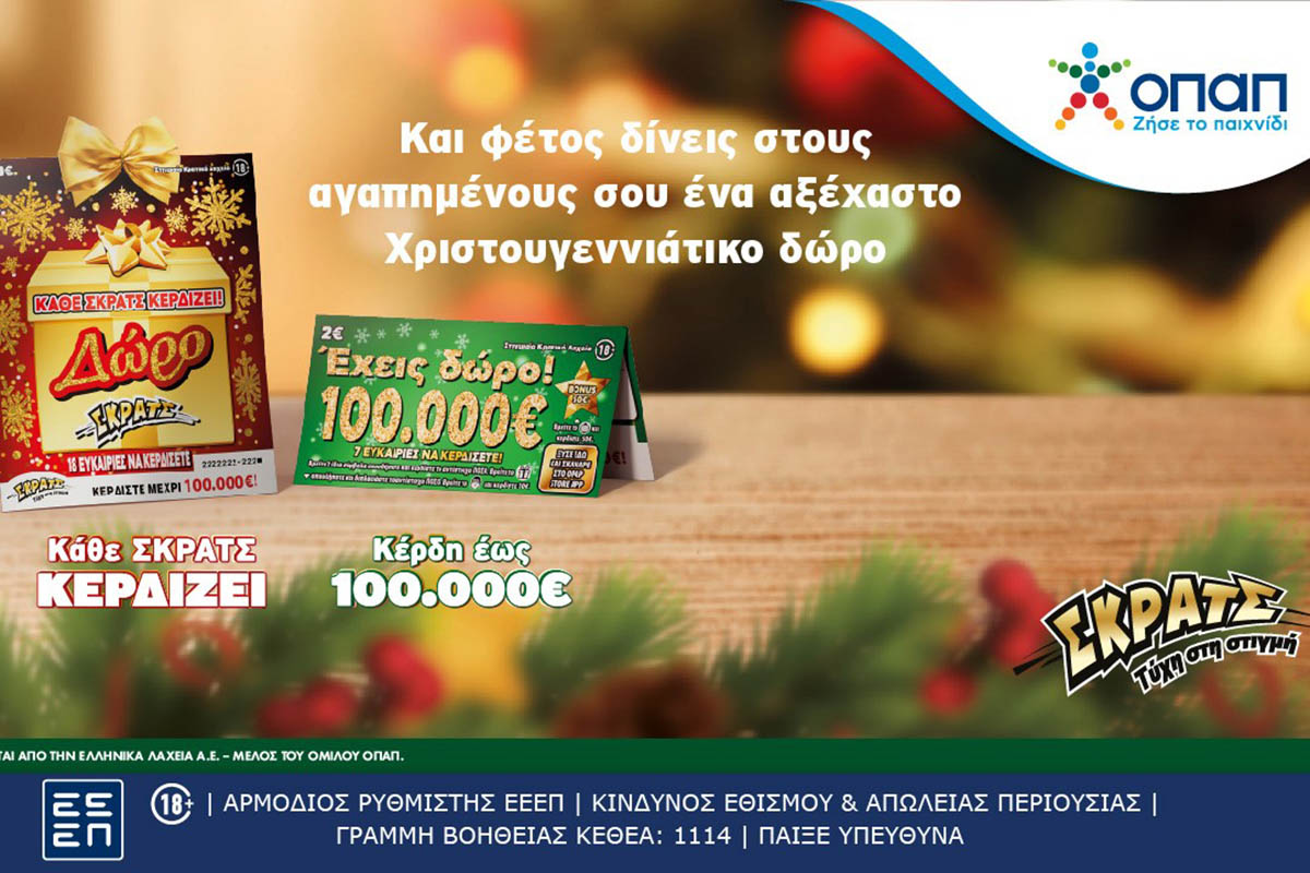 Το νέο εορταστικό παιχνίδι «Δώρο ΣΚΡΑΤΣ» προσφέρει κέρδη έως και 100.000 ευρώ, με όλους τους λαχνούς να κερδίζουν τουλάχιστον 4 ευρώ. Κάθε λαχνός, που κοστίζει 10 ευρώ, διαθέτει περιοχές bonus και ειδική περιοχή για ευχές.