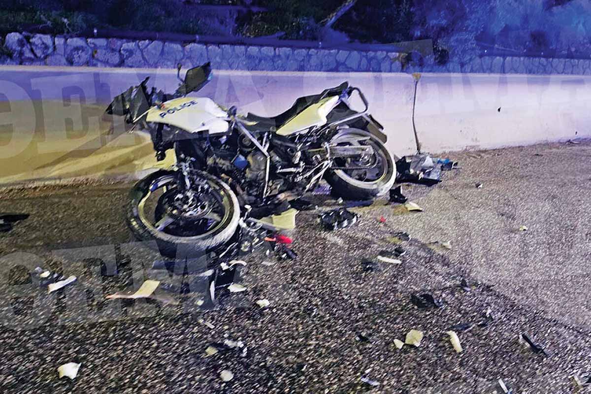 Από εκεί κινήθηκε στο ρεύμα προς Ασπρόπυργο και στο ύψος της λίμνης Κουμουνδούρου φρέναρε απότομα στην προσπάθειά του να κάνει αναστροφή, για να ξεφύγει από τους αστυνομικούς. Ο οδηγός του περιπολικού που ακολουθούσε σε απόσταση αναπνοής κατάφερε να φρενάρει και να σταματήσει μπροστά από το αμάξι που καταδίωκαν. Ομως ο 29χρονος αστυνομικός της ΔΙΑΣ δεν πρόλαβε να φρενάρει και έπεσε πάνω στο προπορευόμενο περιπολικό της ΕΛ.ΑΣ.. Από την πρόσκρουση ο οδηγός της μηχανής εκσφενδονίστηκε σε απόσταση 60 μέτρων από το σημείο της σύγκρουσης, με αποτέλεσμα τον θανάσιμο τραυματισμό του.