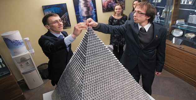 Η Λιθουανία ετοιμάζεται να εγκαταλείψει το εθνικό της νόμισμα και να ενταχθεί στη ζώνη του ευρώ. Για να γιορτάσουν αυτή τη μετάβαση δύο φοιτητές της Φυσικής κατασκεύασαν μια πυραμίδα ύψους 1,3 μ., φτιαγμένη εξ ολοκλήρου από περισσότερα από ένα εκατομμύριο λιθουανικά κέρματα. Το Σάββατο το φοιτητικό δίδυμο τοποθέτησε το τελευταίο κέρμα στην κορυφή της πυραμίδας, η οποία, όπως υποστηρίζουν, είναι η μεγαλύτερη φτιαγμένη αποκλειστικά από κέρματα. Eχει βάρος 831 κιλά και κατασκευάστηκε με τη βοήθεια εθελοντών από το Νομισματικό Μουσείο της Τράπεζας της Λιθουανίας.