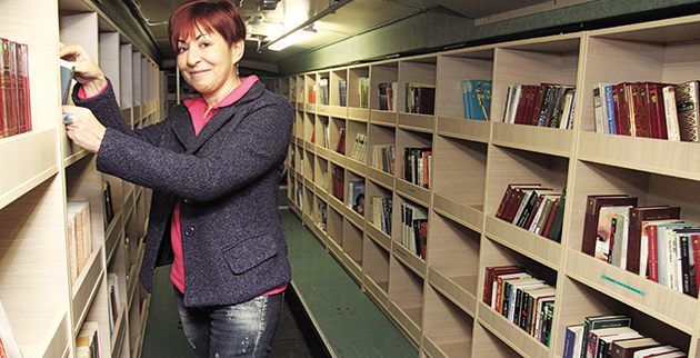 Καθώς μας μιλά για την Κινητή Βιβλιοθήκη, αρκετοί πολίτες μπαίνουν στο πούλμαν, ζητούν πληροφορίες για τη διαδικασία εγγραφής και ορισμένοι «χάνονται» για ώρα μπροστά από τους περίπου 1.200 τίτλους ξεφυλλίζοντας τα βιβλία της αρεσκείας τους.