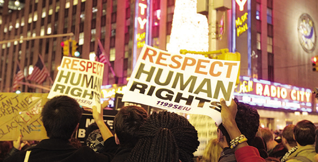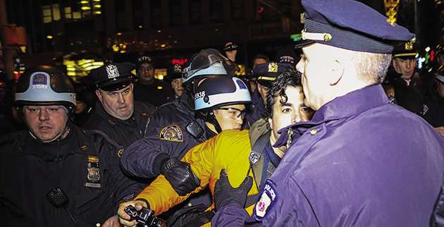 Ωστόσο σε απόσταση μόλις ενός τετραγώνου από την πλατεία Ροκφέλερ η ατμόσφαιρα ήταν κάθε άλλο παρά εορταστική. Διαδηλωτές και ακτιβιστές επιχείρησαν να διακόψουν την τελετή, διαμαρτυρόμενοι για την απόφαση σώματος ενόρκων να μην ασκηθεί δίωξη σε βάρος του λευκού αστυνομικού Ντάνιελ Πανταλέο, ο οποίος σκότωσε τον άοπλο Αφροαμερικανό και πατέρα έξι παιδιών Ερικ Γκάρνερ.