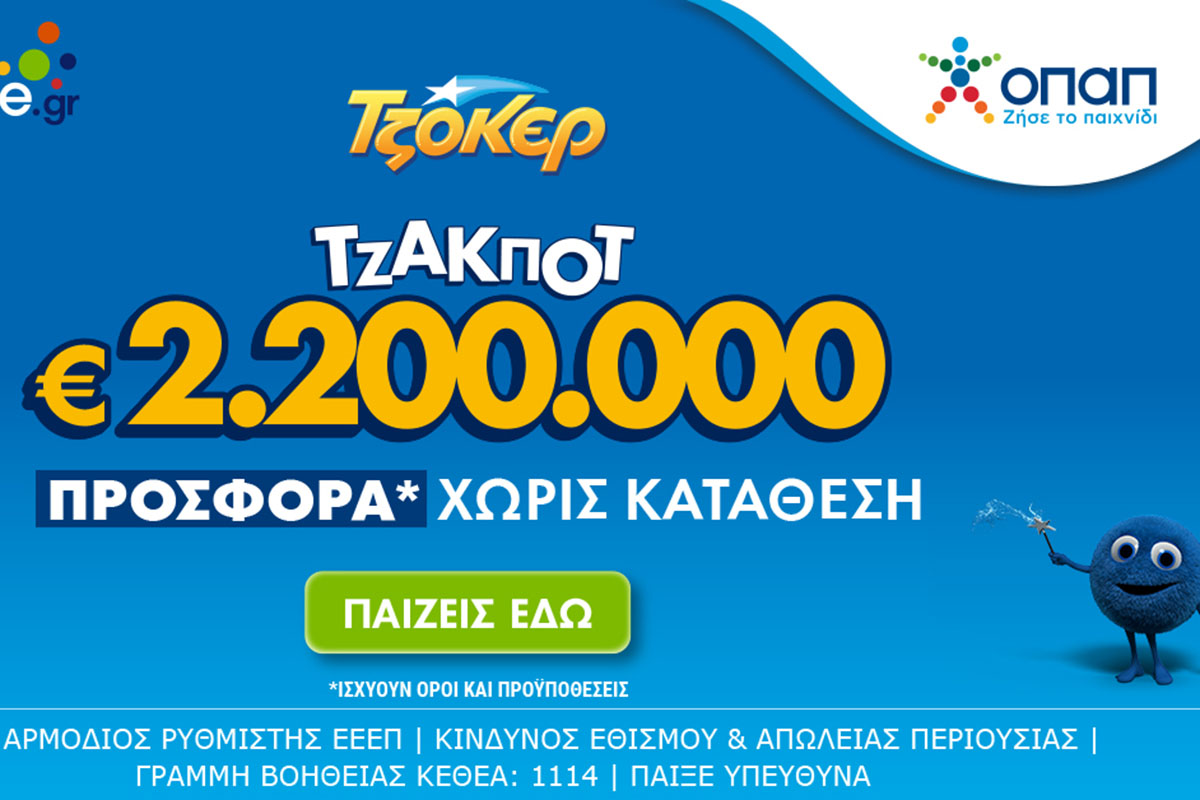 Την ευκαιρία να καταθέτουν τα δελτία τους διαδικτυακά, με λίγα κλικ, έχουν, μέσω του opaponline.gr και του Opaponline App, όλοι όσοι θέλουν να συμμετάσχουν στην αποψινή κλήρωση του ΤΖΟΚΕΡ για τα 2,2 εκατομμύρια ευρώ. Μάλιστα, για όλους τους διαδικτυακούς παίκτες υπάρχει διαθέσιμη προσφορά* χωρίς κατάθεση για όλα τα παιχνίδια αριθμών του ΟΠΑΠ (ΤΖΟΚΕΡ, ΚΙΝΟ, ΛΟΤΤΟ, ΠΡΟΤΟ, SUPER 3) τόσο στο opaponline.gr όσο και στο Opaponline App. Για την προσφορά ισχύουν όροι και προϋποθέσεις.