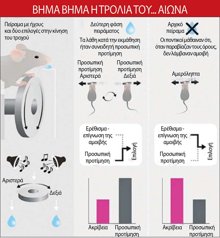 Εβαλαν τα πειραματόζωα σε κλειστό χώρο, όπου υπήρχε ένας τροχός, τον οποίο μπορούσαν να θέσουν σε κίνηση με τα πόδια τους. Οταν ακουγόταν ένας συγκεκριμένος ήχος, έπρεπε να στρέψουν τον τροχό δεξιά, ενώ όταν ακουγόταν ένας άλλος ήχος στα αριστερά, και ως ανταμοιβή έρεε νερό. Οι ποντικοί έμαθαν γρήγορα ότι αν έκαναν λάθος όταν έστρεφαν τον τροχό δεν θα έπιναν νερό, οπότε έκαναν τη σωστή επιλογή με μεγάλη ακρίβεια. Στη δεύτερη φάση του πειράματος οι ερευνητές παρατήρησαν ότι κάποια στιγμή οι ποντικοί άρχιζαν να στρέφουν συνεχώς τον τροχό προς τη λάθος κατεύθυνση, καταστρέφοντας τα αποτελέσματα του πειράματος.