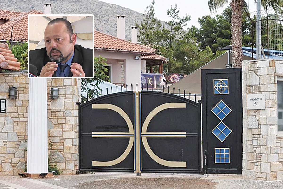 Η κεντρική είσοδος της βίλας με σύμβολα και το πανό του Αρτέμη Σώρρα στο μπαλκόνι