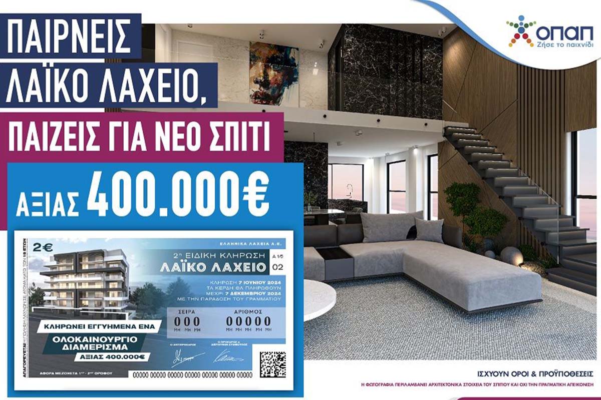 «Είναι η πρώτη φορά που το Λαϊκό Λαχείο κληρώνει ένα τέτοιο εγγυημένο έπαθλο. Πρόκειται για μια νεόδμητη μεζονέτα στο Νομό Αττικής, αξίας 400.000 ευρώ, μεγέθους 116 τ.μ., με 3 δωμάτια και θέση πάρκινγκ», συμπληρώνει.