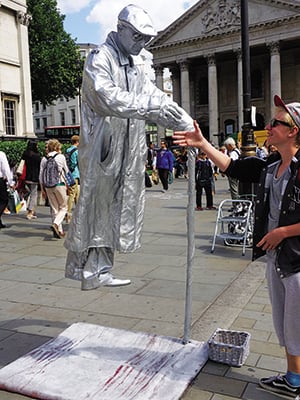 Μερικοί δίνουν μια μίνι παράσταση, κάποιοι άλλοι κάνουν απότομες κινήσεις ή περίεργους θορύβους ως αντάλλαγμα για τα φιλοδωρήματα. Ολοι τους περνούν τουλάχιστον πέντε ώρες την εβδομάδα απλώνοντας και αφαιρώντας το παχύρρευστο μακιγιάζ τους και 50 ώρες ακινησίας υπό παντός είδους καιρικές συνθήκες, τη στιγμή που στον ελεύθερο χρόνο τους κάνουν γυμναστική για να κρατούνται σε καλή φυσική κατάσταση και φυσικά εξάσκηση της τέχνης τους.