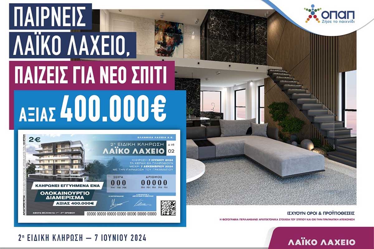 O χρόνος μετρά αντίστροφα για την 2η ειδική κλήρωση του Λαϊκού Λαχείου, καθώς αυτή την Παρασκευή θα κληρώσει ένα ολοκαίνουριο σπίτι αξίας 400.000 ευρώ. Οι λαχνοί για την 2η ειδική κλήρωση του Λαϊκού Λαχείου είναι διαθέσιμοι στα καταστήματα ΟΠΑΠ όλης της Ελλάδας, σε λαχειοπώλες, περίπτερα, μίνι μάρκετ και επιλεγμένα πρατήρια υγρών καυσίμων. Το κόστος των λαχνών ανέρχεται στα 2 ευρώ, ενώ η 5άδα κοστίζει 10 ευρώ.