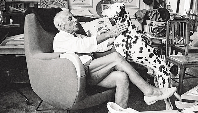 Εξίσου τρυφερό -αν και δεν συγκρίνεται σε επίπεδο σεξαπίλ- είναι το φωτογραφικό ενσταντανέ που δείχνει τον Πάμπλο Πικάσο με τον Περό, ένας από τους πολλούς σκύλους Δαλματίας που είχε. Ο διάσημος ζωγράφος καθισμένος σε μια πολυθρόνα στην πολυτελή Villa La Californie, μέγαρο του 19ου αιώνα στους λόφους των Καννών, χαϊδεύει τον σκύλο του, ο οποίος έχει ανέβει με τα μπροστινά πόδια του στην πολυθρόνα.