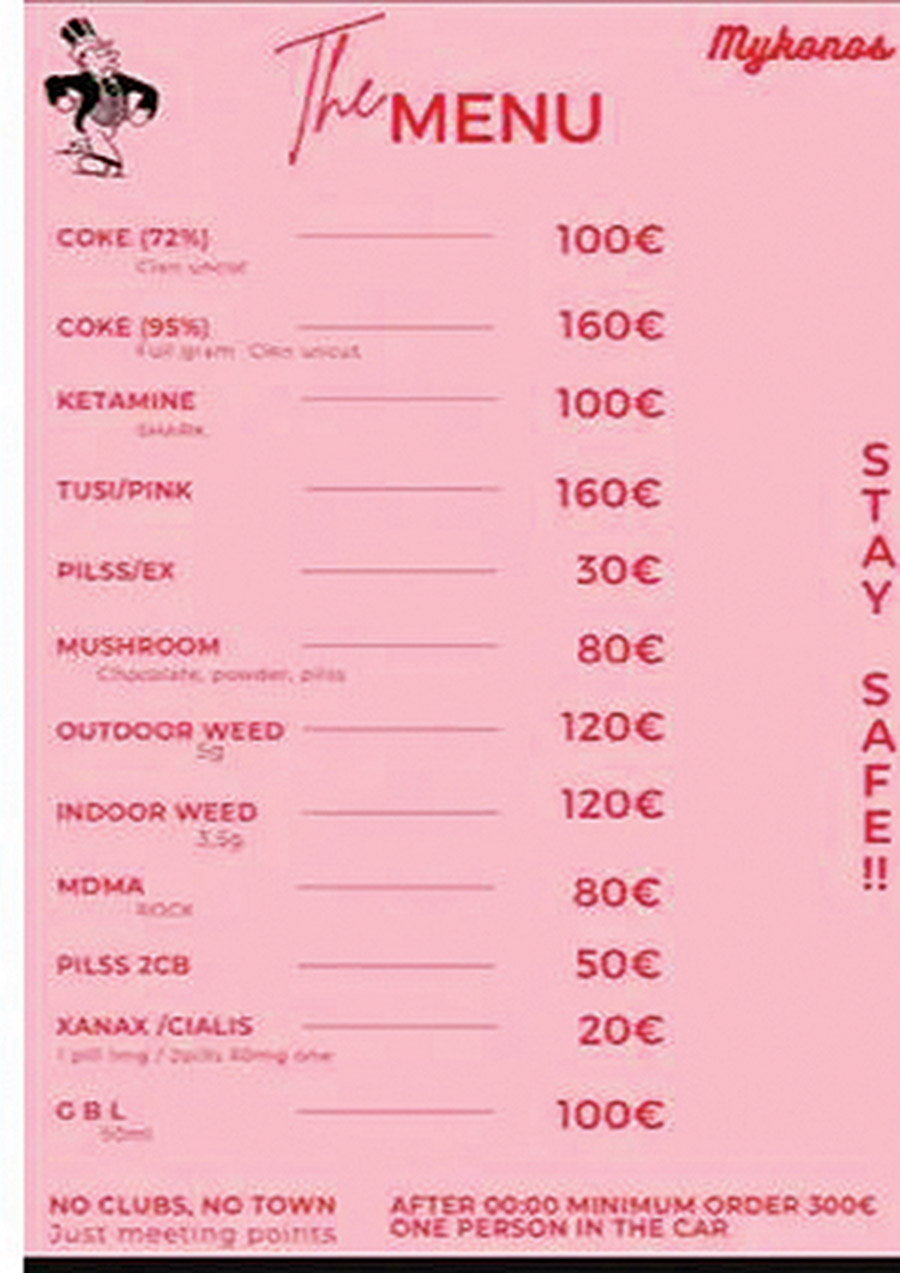 Και μάλιστα η «τριάδα» από την Πολωνία, που ζούσε στην Ψαρού, δεν διακινούσε μόνο τη «λευκή κυρία», αλλά κάθε είδος παραισθησιογόνου, από κεταμίνη μέχρι MDMA, ενώ στο ροζ τυπωμένο μενού ξεχώριζε στον τιμοκατάλογο η «καθαρότητα» της κοκαΐνης που σε ποσοστό 95% κόστιζε 160 ευρώ το γραμμάριο σε αντίθεση με τα 100 ευρώ που αφορούσε την «καθαρότητα» σε ποσοστό 72%.