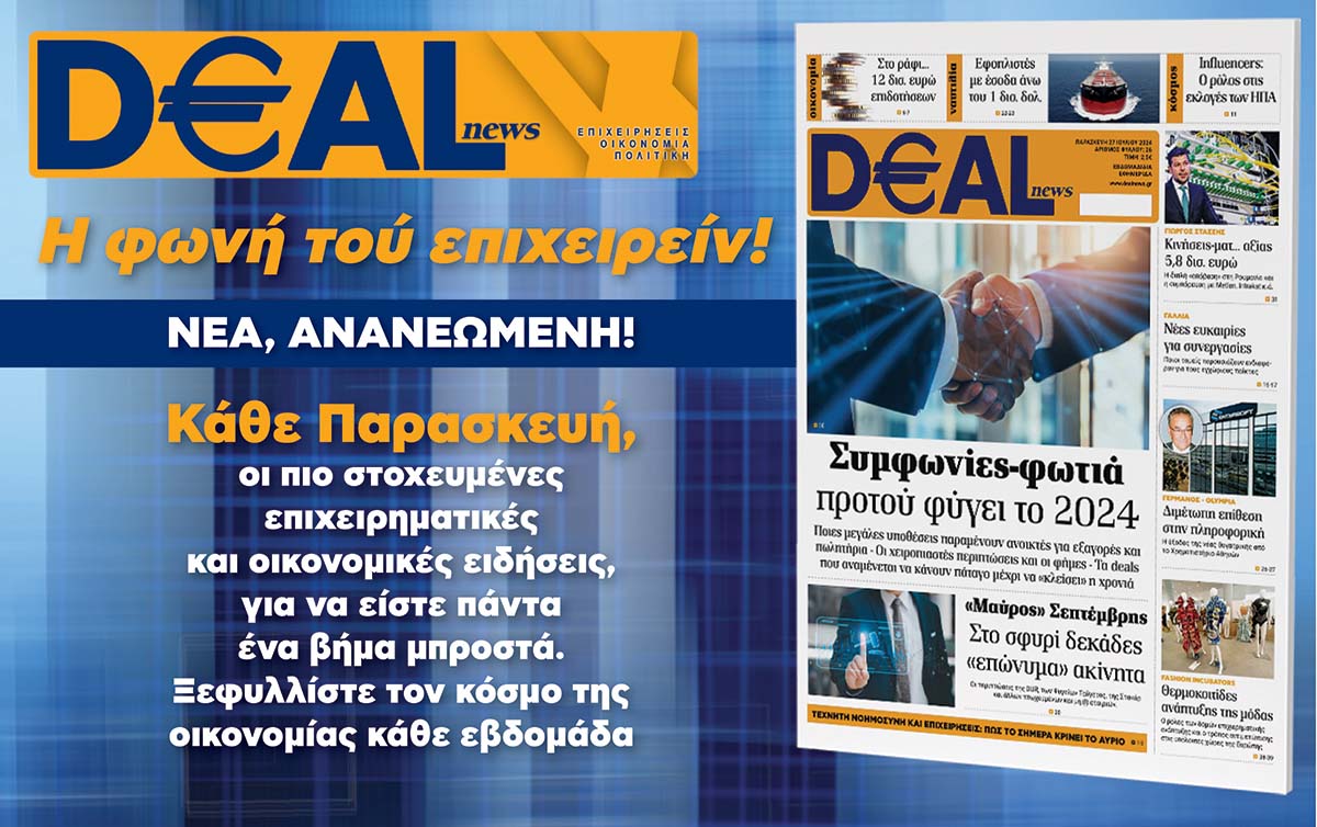Σε νέα εποχή περνά η «DEALnews», η εβδομαδιαία εφημερίδα για τις επιχειρήσεις και την οικονομία. Από την Παρασκευή 6 Σεπτεμβρίου 2024 κυκλοφορεί με ανανεωμένη μορφή.