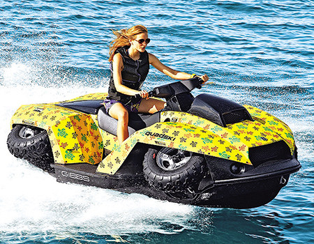 Το τζετ σκι συναντάει τη «γουρούνα» και το αποτέλεσμα είναι το Quadski duo. Θεωρείται το καλύτερο μεγάλης ταχύτητας αμφίβιο του κόσμου, που μπορεί να μεταμορφωθεί σε όχημα που βολτάρει στη θάλασσα ή σε μέσο μεταφοράς στην ξηρά! Η ταχύτητά του είναι εντυπωσιακή χάρη στον 1.300 cc BMW κινητήρα του. Για να τονιστεί δε ο αμφίβιος χαρακτήρας του το όχημα έχει σχέδιο που παραπέμπει σε καβούκι χελώνας.