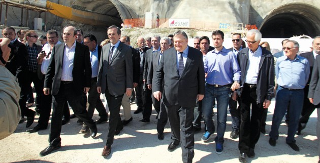 Οι τρεις πολιτικοί, συνοδευόμενοι από τον υπουργό Ανάπτυξης Κωστή Χατζηδάκη και τον αναπληρωτή υπουργό Σταύρο Καλογιάννη, επισκέφτηκαν τρία σημεία του έργου: το 111ο χιλιόμετρο της εθνικής οδού κοντά στο Κιάτο και τις σήραγγες του Πλατάνου και της περιοχής Μαύρα Λιθάρια, κοντά στο Δερβένι.