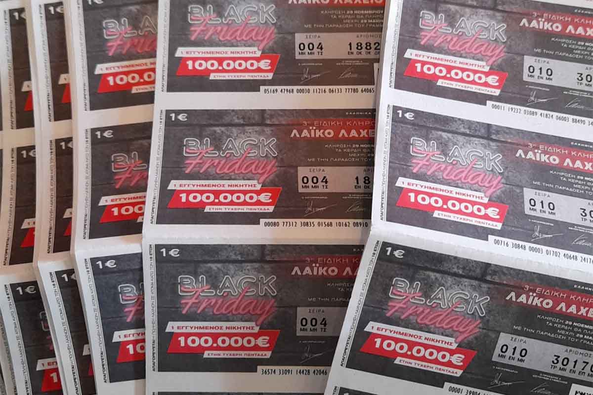 Σε ρυθμό Black Friday κινείται το Λαϊκό Λαχείο, με την ειδική κλήρωση του ιστορικού παιχνιδιού να μοιράζει εγγυημένα 100.000 ευρώ την Παρασκευή 29 Νοεμβρίου.