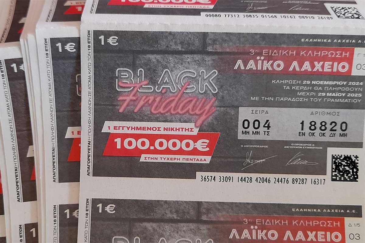 Λίγες ώρες απομένουν για την ειδική κλήρωση Black Friday του Λαϊκού Λαχείου, με το ιστορικό παιχνίδι του ΟΠΑΠ να μοιράζει εγγυημένα 100.000 ευρώ στην τυχερή πεντάδα την Παρασκευή 29 Νοεμβρίου.