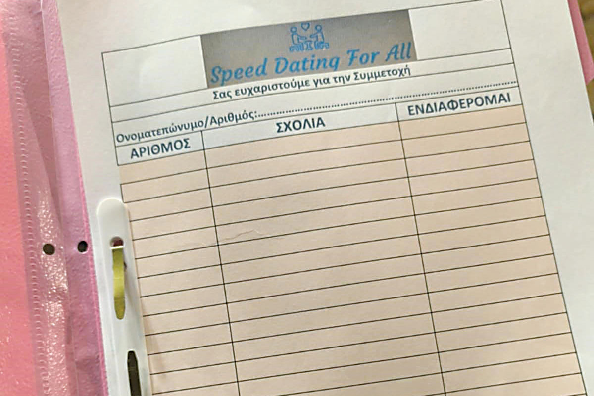 Οι δείκτες του ρολογιού την πρώτη Κυριακή του Νοεμβρίου έδειχναν 19.30, όταν περάσαμε την πόρτα του μπαρ επί της οδού Αστιγγος, στο Θησείο, όπου μισή ώρα νωρίτερα ήταν προγραμματισμένο να ξεκινήσει ένα από τα πολλά speed dating events γνωστής εταιρίας διοργάνωσης εκδηλώσεων. Μία ώρα αργότερα το ίδιο βράδυ και ούτε τρία χιλιόμετρα μακριά -συγκεκριμένα στο Σύνταγμα- επρόκειτο να ξεκινήσει ένα άλλο speed dating για… μοναχικές καρδιές με διαφορετική διοργανώτρια εταιρία, γεγονός που εξαρχής μας είχε κινήσει την περιέργεια και μας έκανε να αναρωτηθούμε πόσο μεγάλη πέραση έχουν τελικά οι εκδηλώσεις αυτού του είδους στους ελεύθερους άνδρες και γυναίκες που νιώθουν απογοητευμένοι από τα σύγχρονα τεχνολογικά «εργαλεία», τα οποία προσφέρονται για νέες γνωριμίες!
