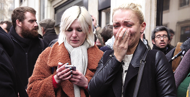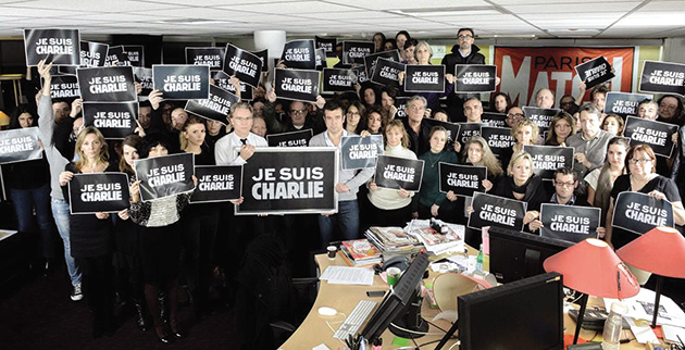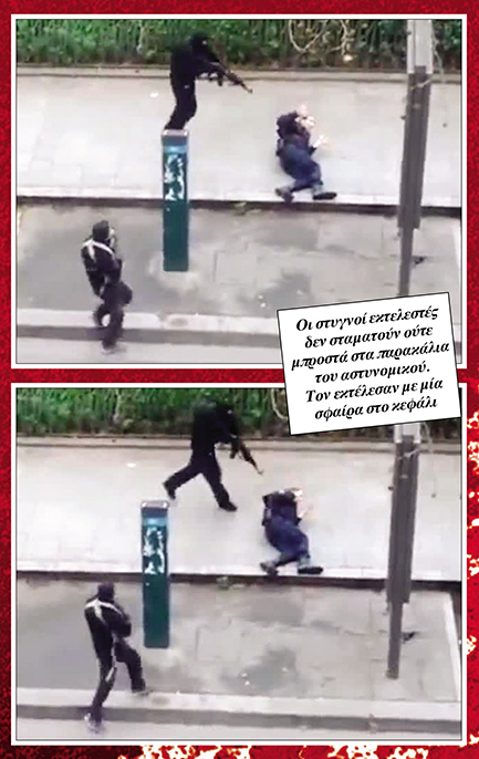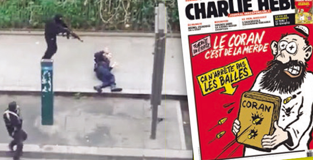 Τρεις ένοπλοι άνδρες, κραυγάζοντας συνθήματα υπέρ του Ισλάμ, εισέβαλαν μέρα μεσημέρι στα γραφεία του περιοδικού που από τη δεκαετία του ’70 κάνει σκληρή σάτιρα εναντίον όλων και «γάζωσαν» με καλάσνικοφ δώδεκα ανθρώπους, στην πιο αιματηρή επίθεση στη Γαλλία τις τελευταίες τέσσερις δεκαετίες. Ρίγη προκαλεί το βίντεο που δείχνει έναν από τους αστυνομικούς που σκοτώθηκαν να εκλιπαρεί για τη ζωή του και τους δράστες να τον πυροβολούν σχεδόν εξ επαφής στο κεφάλι. Μεταξύ των νεκρών είναι τέσσερις κορυφαίοι γελοιογράφοι της εφημερίδας, ο Σεμπαστιάν Σαρμπονιέρ (Charb), διευθυντής σύνταξης του περιοδικού και «μπροστάρης» της αντιμουσουλμανικής θεματολογίας του περιοδικού, ο Ζαν Καμπί (Cabu), με αγαπημένους «στόχους» τον Φρανσουά Μιτεράν, τον Ζακ Σιράκ και τον Ζαν Μαρί Λεπέν, ο «ερωτομανής», όπως τον χαρακτήριζαν, Βολίνσκι (Wolinski) και ο Τίνιους (Tignous).