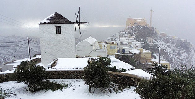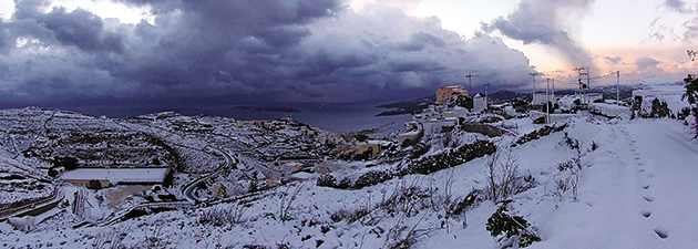 Στα λευκά έντυσε βουνά, λαγκάδια και… παραλίες το κύμα σφοδρής κακοκαιρίας με πολικές θερμοκρασίες, το οποίο εκδηλώθηκε τα τελευταία 24ωρα! Το πυκνό χιόνι δεν περιορίστηκε σε ορεινές και πεδινές περιοχές της ηπειρωτικής χώρας, αλλά κάλυψε ακόμη και τις Κυκλάδες, δημιουργώντας ένα σπάνιο χειμωνιάτικο σκηνικό και εικόνες που παραπέμπουν σε πίνακες ζωγραφικής! Χαρακτηριστικά παραδείγματα η Σαντορίνη, όπου το λευκό σκέπασε σε μεγάλο βαθμό τα σκούρα ηφαιστειακά εδάφη, και η Τήνος, όπου το έστρωσε όχι μόνο στις ορεινές αλλά και στις παραθαλάσσιες περιοχές.
