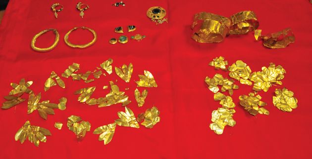 Ο 59χρονος κατείχε -μεταξύ άλλων- δύο χρυσά σκουλαρίκια, ένα χρυσό κόσμημα με ημιπολύτιμους λίθους και μαργαριτάρια, πέντε άλλα κοσμήματα με ημιπολύτιμους λίθους, δύο στριφτά βραχιόλια και ένα χρυσό έλασμα. Η Αστυνομία ερευνά την προέλευση των αρχαίων και θεωρείται σίγουρο ότι προέρχονται από κάποιο τάφο, ωστόσο ο 59χρονος δεν έδωσε στοιχεία για το σημείο όπου τα ανακάλυψε. Ο ανιχνευτής μετάλλων που βρέθηκε στο σπίτι του θεωρείται απόδειξη ότι ο ίδιος έκανε τις λαθρανασκαφές και αναζητούσε αγοραστές. Σε βάρος του 59χρονου σχηματίστηκε δικογραφία για παράβαση του νόμου περί προστασίας των αρχαιοτήτων και της εν γένει πολιτιστικής κληρονομιάς.