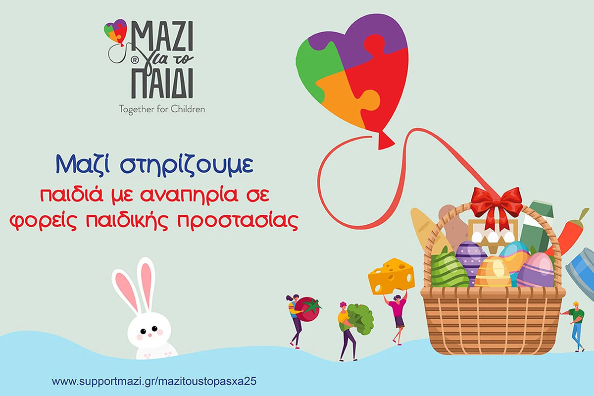 Το Μαζί για το Παιδί σας προσκαλεί φέτος το Πάσχα να γίνετε μέρος μιας πρωτοβουλίας αγάπης και προσφοράς, στηρίζοντας 250 παιδιά με αναπηρία που φιλοξενούνται σε φορείς παιδικής προστασίας σε όλη την Ελλάδα.