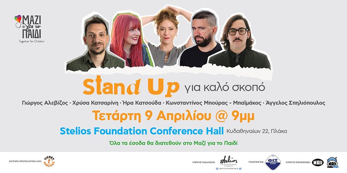 Το Μαζί για το Παιδί σας προσκαλεί σε μια βραδιά γέλιου και προσφοράς. Πέντε ταλαντούχοι stand up κωμικοί, οι Γιώργος Αλεβίζος, Χρύσα Κατσαρίνη, Ήρα Κατσούδα, Κωνσταντίνος Μπούρας-Μπαϊμάκος και Άγγελος Σπηλιόπουλος ενώνουν τις δυνάμεις τους στη σκηνή, προσφέροντας άφθονο γέλιο με έναν κοινό στόχο: τη στήριξη των παιδιών που το έχουν ανάγκη.