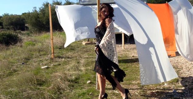 Στο γύρισμα που κράτησε μία ολόκληρη ημέρα -υπό το άγρυπνο βλέμμα του σκηνοθέτη Βαγγέλη Τσαουσόπουλου- η σέξι ηθοποιός έδωσε τον καλύτερο εαυτό της. Φορώντας ένα δαντελένιο, μαύρο φόρεμα και μαύρες ψηλοτάκουνες γόβες «έπαιξε» με τα απλωμένα λευκά σεντόνια στο φόντο, έτρεξε στους χωματόδρομους και στα χωράφια με μια ψιλή εσάρπα στους ώμους και δεν διαμαρτυρήθηκε λεπτό για τις πολικές θερμοκρασίες που επικρατούσαν.