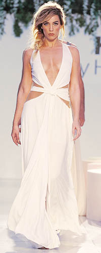 Με την Κατερίνα Στικούδη στο catwalk να είναι πιο σέξι από ποτέ, ο Γιάννης Τόγκος και ο οίκος Kathy Heyndels ανέδειξαν τη γυναικεία ομορφιά με νυφικά που είχαν αρχαιοελληνική αύρα. Η τραγουδίστρια και μοντέλο φόρεσε δημιουργίες με αβυσσαλέο ντεκολτέ, ενώ από τις μεγάλες στιγμές της ήταν όταν τη μετέφεραν στην πασαρέλα δύο άνδρες μοντέλα με γαμπριάτικα κοστούμια του οίκου Giannetos. Η σέξι Κατερίνα εμφανίστηκε με… μπλε φόρεμα που διέθετε αποκαλυπτικό μπούστο και σανδάλια, τα οποία έδεναν μέχρι ψηλά στη γάμπα.