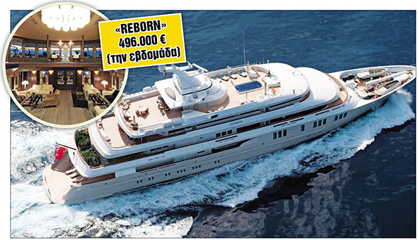 Μεταξύ αυτών τα οποία συναντά κανείς δεμένα στις μαρίνες των Καννών και της Βενετίας, όταν βρίσκονται σε εξέλιξη τα μεγάλα φεστιβάλ κινηματογράφου, είναι το «Reborn», το οποίο διατίθεται για ενοικίαση αντί περίπου 496.000 ευρώ την εβδομάδα. Προκειμένου να λειτουργήσει αυτό το τεράστιο πλωτό «συγκρότημα» απαιτείται 25μελές πλήρωμα, ενώ μπορεί να φιλοξενήσει 75 καλεσμένους. Διαθέτει πλήρως εξοπλισμένο spa, κομμωτήριο και «θερινό» κινηματογράφο, ενώ το μεγάλο κατάστρωμά του μπορεί να διαμορφωθεί έτσι ώστε να φιλοξενήσει τα πιο λαμπερά γκαλά. Οσοι από τους καλεσμένους θέλουν να απομακρυνθούν από το πλήθος, μπορούν να καταφύγουν στον κήπο που χαρακτηρίζεται από ποικιλία φυτών.