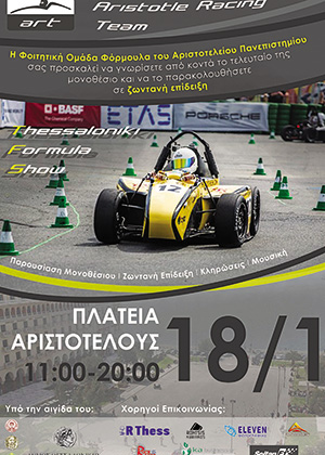 Την Κυριακή από τις 11.00 το πρωί έως τις 8.00 το βράδυ οι κάτοικοι και οι επισκέπτες της πόλης θα μπορούν να δουν από κοντά το μονοθέσιο ART-14 της ομάδας Aristotle Racing Team (ART) του Αριστοτέλειου Πανεπιστημίου Θεσσαλονίκης. Με το συγκεκριμένο μονοθέσιο η ομάδα έχει έρθει (μεταξύ άλλων) 3η στα στατικά αγωνίσματα σε διαγωνισμό στην Ουγγαρία, 4η στη γενική κατάταξη στην Ιταλία και 12η στη γενική κατάταξη ανάμεσα σε 75 ομάδες σε διαγωνισμό της Γερμανίας.
