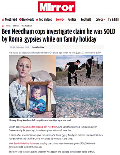 Μεγάλο αφιέρωμα έκανε και το τηλεοπτικό κανάλι ITV, που κι εκείνο με τη σειρά του επισήμανε πόσο σημαντική βοήθεια προσέφεραν η Ελληνίδα «Μις Μαρπλ» και το επιτελείο της στην εξέλιξη της υπόθεσης, δίνοντας έτσι ελπίδες στη μητέρα του Μπεν πως κάποια μέρα θα τον σφίξει ξανά στην αγκαλιά της.