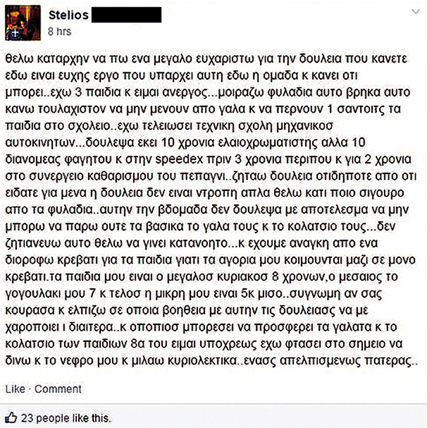 «Είναι ευχής έργον που υπάρχει αυτή εδώ η ομάδα και κάνει ό,τι μπορεί. Εχω τρία παιδιά και είμαι άνεργος. Μοιράζω φυλλάδια, αυτό βρήκα, αυτό κάνω, τουλάχιστον να μη μένουν από γάλα και να παίρνουν ένα σάντουιτς τα παιδιά στο σχολείο. Εχω τελειώσει σε τεχνική σχολή μηχανικός αυτοκίνητων. Δούλεψα εκεί δέκα χρόνια ελαιοχρωματιστής, άλλα δέκα διανομέας φαγητού και στη Speedex πριν τρία χρόνια περίπου και για δύο χρόνια στο συνεργείο καθαρισμού του ΠΕΠΑΓΝΗ. Ζητάω δουλειά, οτιδήποτε. Από ό,τι είδατε, για μένα η δουλειά δεν είναι ντροπή, απλώς θέλω κάτι πιο σίγουρο από τα φυλλάδια. Αυτή την εβδομάδα δεν δούλεψα, με αποτέλεσμα να μην μπορώ να πάρω ούτε τα βασικά, το γάλα τους και το κολατσιό τους. Δεν ζητιανεύω, αυτό θέλω να γίνει κατανοητό. Και έχουμε ανάγκη από ένα διώροφο κρεβάτι για τα παιδιά, γιατί τα αγόρια μου κοιμούνται μαζί σε μονό κρεβάτι. Τα παιδιά μου είναι ο μεγάλος Κυριάκος 8 χρόνων, ο μεσαίος το Γογουλάκι μου 7 και τέλος η μικρή μου είναι 5 και μισό. Συγγνώμη αν σας κούρασα και ελπίζω σε όποια βοήθεια, με αυτήν της δουλειάς να με χαροποιεί ιδιαίτερα και όποιος μπορέσει να προσφέρει τα γάλατα και το κολατσιό των παιδιών θα του είμαι υπόχρεος. Εχω φτάσει στο σημείο να δίνω και το νεφρό μου, και μιλάω κυριολεκτικά. Ενας απελπισμένος πατέρας».