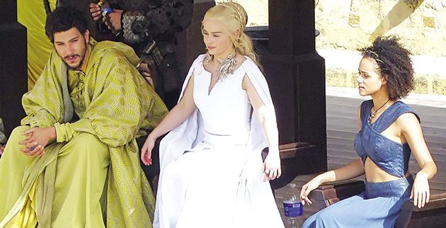 Πριν από λίγο καιρό ήρθαν στη δημοσιότητα νέες φωτογραφίες από τα γυρίσματα που γίνονται σε τρεις διαφορετικές χώρες. Αν και ανάμεσά τους θα μπορούσε να βρίσκεται η Ελλάδα, οι υπεύθυνοι της αμερικανικής παραγωγής προτίμησαν την Ισπανία προκειμένου να «ζωντανέψουν» κάποια από τα πιο σημαντικά μέρη του κόσμου του Martin. Στην Οσούνα θα στηθεί η αρένα του Meereen, όπου ένας -όχι και τόσο παλιός- γνώριμός μας θα δώσει μάχη ζωής ή θανάτου, η Σεβίλη μετατρέπεται σε… Dorne, πατρίδα των Martells, ενώ η Κόρδοβα θα φιλοξενήσει σκηνές σκλαβοπάζαρου, αφού θα… γίνει η πόλη Volantis.