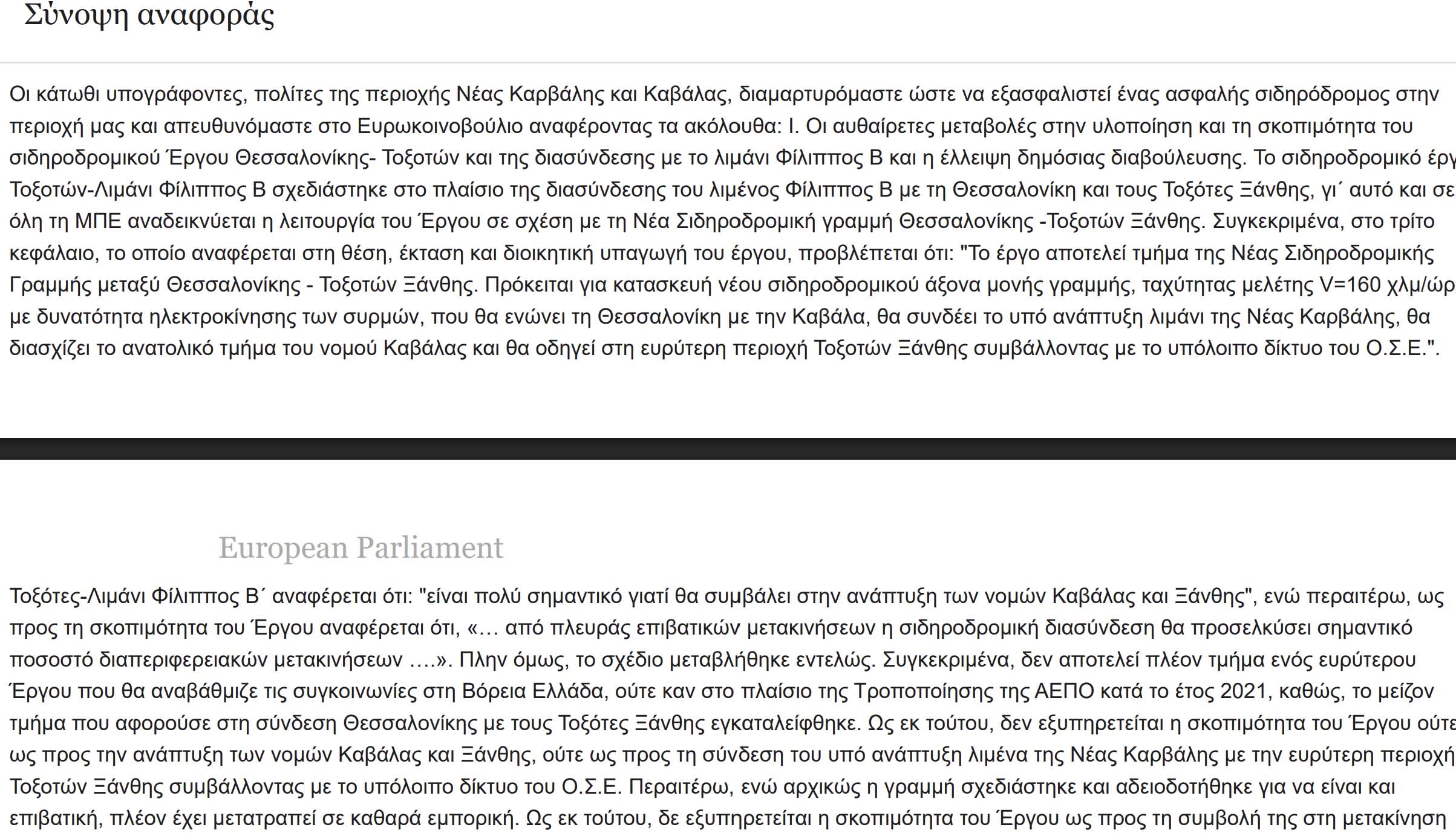 Η Ενωση σημειώνει πως «διαμαρτυρόμαστε ώστε να εξασφαλιστεί ένας ασφαλής σιδηρόδρομος στην περιοχή μας» και απευθύνεται στο Ευρωκοινοβούλιο για μια σειρά από ζητήματα, καταγγέλλοντας: