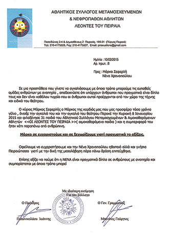 «Οφείλουμε να ευχαριστήσουμε» αναφέρει η επιστολή «και τη Νένα Χρονοπούλου, ηθοποιό αλλά και γνήσια Πειραιώτισσα, γιατί με τη δική της μεσολάβηση η παραπάνω δράση επιτεύχθηκε. Αξίζει να πούμε ότι είναι πραγματικά δίπλα σε ανθρώπους με αναπηρία και συμπαρίσταται με όποιον τρόπο μπορεί».