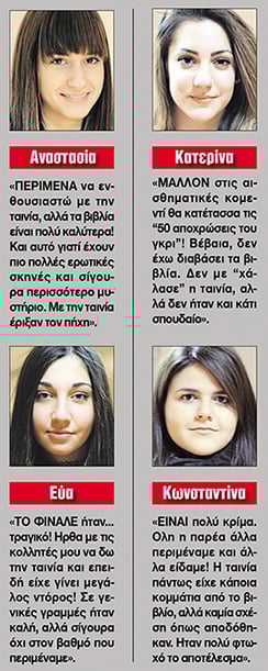 Στην Αθήνα, σε έναν από τους μεγαλύτερους κινηματογράφους, οι παρέες των κοριτσιών έκαναν… απόβαση. Κάτι αντίστοιχο συνέβη και σε σινεμά της Θεσσαλονίκης, όπου επίσης η παρακολούθηση της πρεμιέρας αποδείχτηκε γυναικεία υπόθεση! Σε κινηματογράφο των βορείων προαστίων παρέες 20χρονων κοριτσιών πήραν θέση μέσα στην αίθουσα και περίμεναν με αγωνία και μεγάλες προσδοκίες να δουν στη μεγάλη οθόνη όλο το «μεγαλείο» του πάμπλουτου και όμορφου νεαρού επιχειρηματία κ. Γκρέι, να κάνει πράξη τις σαδομαζοχιστικές του φαντασιώσεις πάνω στην «άσπιλη» και άκρως γοητευτική νεαρή φοιτήτρια Αναστέζια. Η ταινία ξεκίνησε και τα λεπτά περνούσαν χωρίς να προβάλλεται ούτε μία σκηνή ερωτικού περιεχομένου. Τα κοριτσόπουλα μιλούσαν μεταξύ τους ψιθυριστά. Και ενώ το ζευγάρι ερχόταν όλο και πιο κοντά στη μεγάλη οθόνη, οι θεατές που παρακολουθούσαν εναγωνίως να αρχίσουν οι ερεθιστικές στιγμές άρχισαν σιγά σιγά να απογοητεύονται. Τότε ξεκίνησαν οι πρώτες… φωνές!