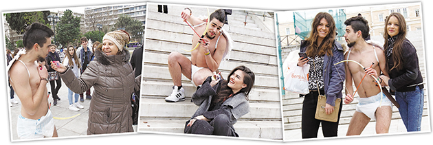 «Φόρεσα τα φτερά μου, μια πάνα απ’ αυτές για την ακράτεια και ξεκίνησα το παιχνίδι με τους περαστικούς» συνέχισε ο Crazy Tsach, τη δράση του οποίου κατέγραψε καρέ καρέ ο φωτογραφικός φακός της «Espresso». «Το διασκέδασα πολύ. Εριξα βελάκια στους περαστικούς και μοίρασα προφυλακτικά λέγοντάς τους να τα χρησιμοποιήσουν το βράδυ της γιορτής των ερωτευμένων».
