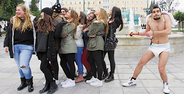 Τι και αν έκανε τσουχτερό κρύο το πρωί της περασμένης Πέμπτης; Εκείνος δεν πτοήθηκε. Εφτασε στο Σύνταγμα με το μετρό, έβγαλε τα ρούχα του και έμεινε με την αμφίεση του φτερωτού θεού.