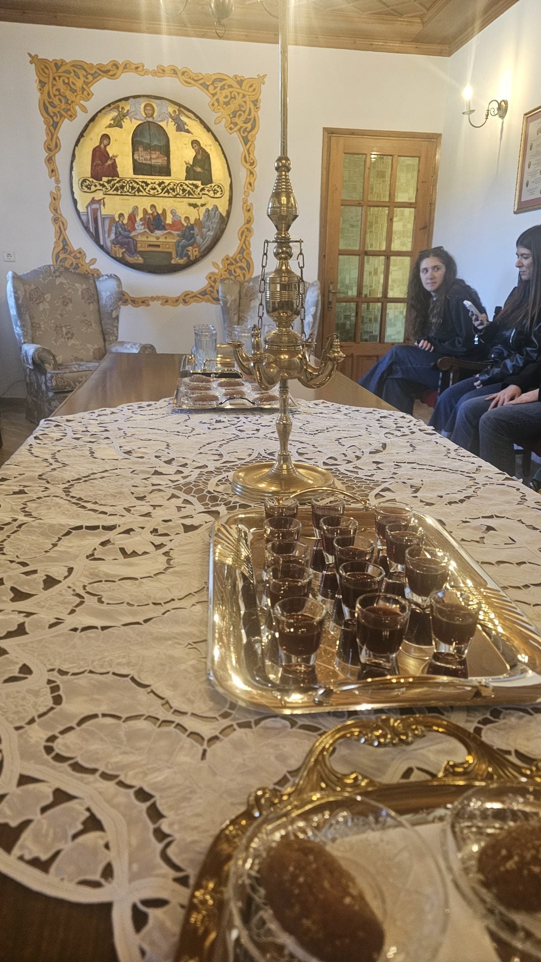 Ο πατέρας Σαμουήλ μαζί με τον ηγούμενο Μελχισεδέκ μας φιλεύουν μελομακάρονα και νερό και μας τονίζουν ότι τη μονή επισκέπτονται πολλές άτεκνες που θαυματουργικά, μετά την επίσκεψή τους, αξιώνονται να γίνουν μάνες.