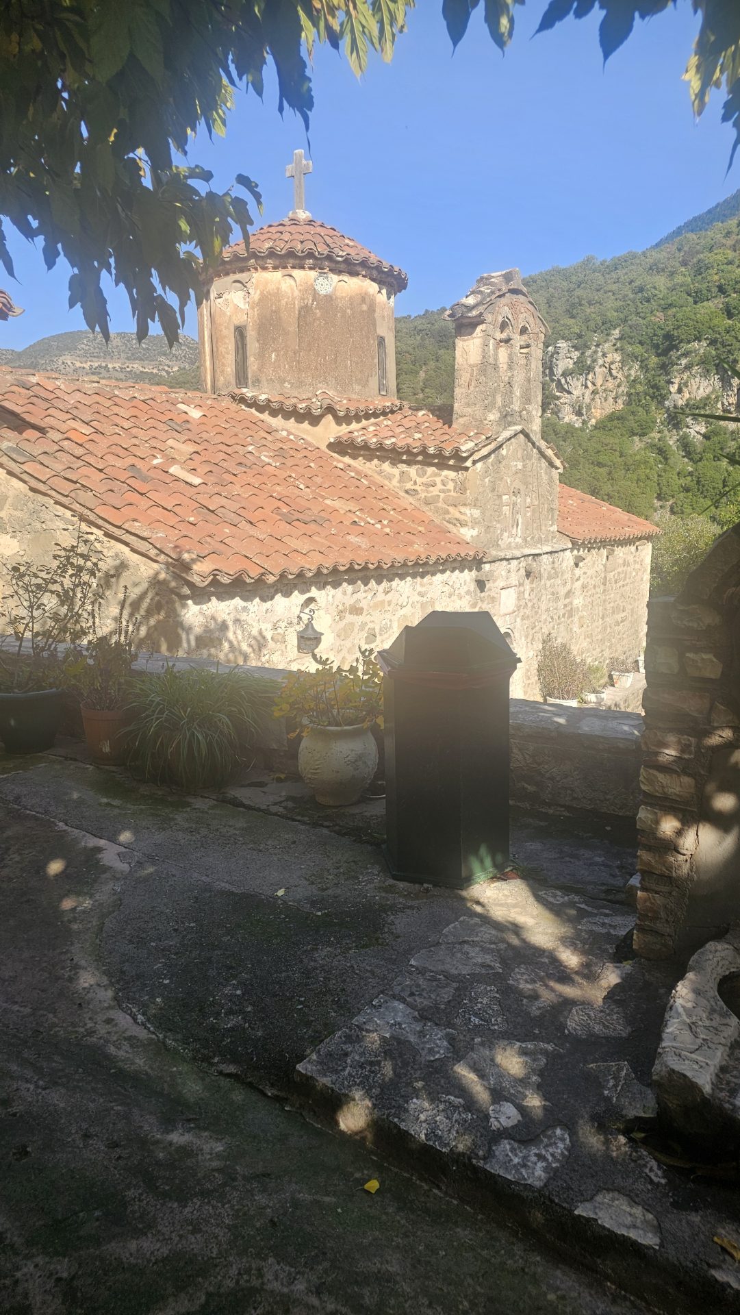 Ο μοναχός Νεκτάριος μάς λέει την ιστορία της μονής και μας ζητά τα ονόματά μας για να τα διαβάσει υπέρ υγείας. Το να βρεθούμε στο Κρυφό Σχολειό είναι πλέον αδύνατον, αφού δρόμος δεν υπάρχει και ο χώρος είναι κατεστραμμένος.
