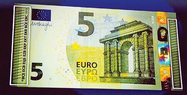 Το νέο χαρτονόμισμα των 5 ευρώ θα κυκλοφορήσει σε όλη την Ευρωζώνη σήμερα Μεγάλη Πέμπτη, 2 Μαΐου. Στο υδατογράφημα και στο ολόγραμμα εμφανίζεται μια προσωπογραφία της Ευρώπης, μορφής της ελληνικής μυθολογίας από την οποία προήλθε και η ονομασία της νέας σειράς τραπεζογραμματίων. Με τη βοήθεια μικρών ανάγλυφων γραμμών στην αριστερή και τη δεξιά άκρη του τραπεζογραμματίου διευκολύνεται η αναγνώρισή του, ιδίως από άτομα με προβλήματα όρασης.