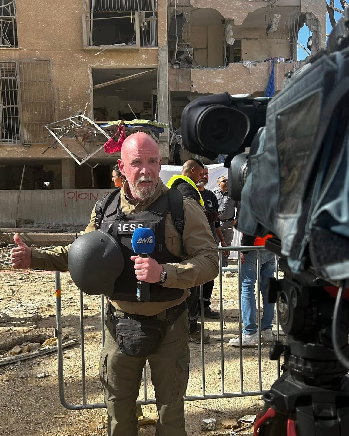 Ο πολεμικός ανταποκριτής της ΕΡΤ Γιώργος Σιδέρης τόνισε σε ζωντανή σύνδεση από το Ισραήλ: «Είμαι στο Τελ Αβίβ 22 ημέρες και βιώνω μαζί με τους πολίτες αυτής της πόλης πολύ δύσκολες συνθήκες. Σε αυτόν τον πόλεμο υπάρχει μεγάλη λογοκρισία από το Ισραήλ. Για μένα ήταν πολύ σημαντικό που πέρασα από το τμήμα πολεμικών ανταποκριτών, των ΜΜΕ του Αριστοτέλειου Πανεπιστημίου Θεσσαλονίκης. Μεγάλο σχολείο, με δίδαξε πολλά, ακόμα και στο πώς φοράς μια μάσκα σε περίπτωση χημικού πολέμου, πώς παίρνεις φάρμακα για εγκαύματα».