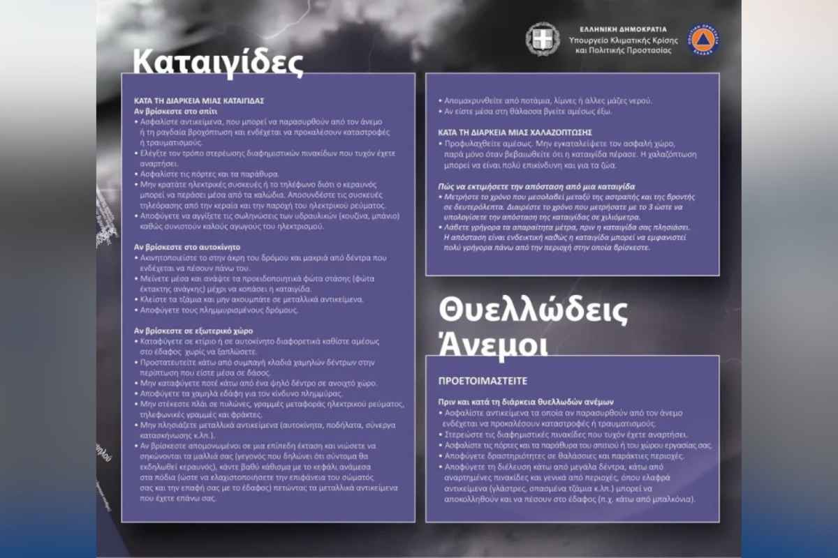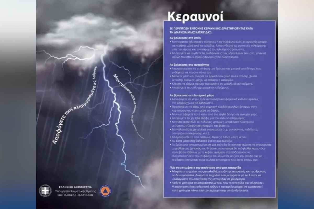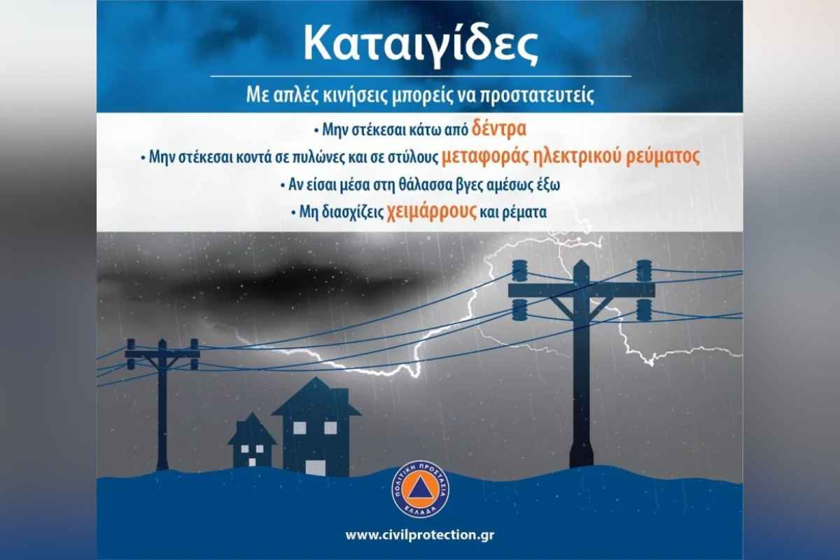 Ιδιαίτερη προσοχή χρειάζεται και σε περιπτώσεις έντονης κεραυνικής δραστηριότητας, χαλαζόπτωσης, χιονόπτωσης ή παγετού, με τις αρχές να υπογραμμίζουν ότι οι πολίτες θα πρέπει να ακολουθούν πιστά τις οδηγίες των αρμόδιων φορέων.